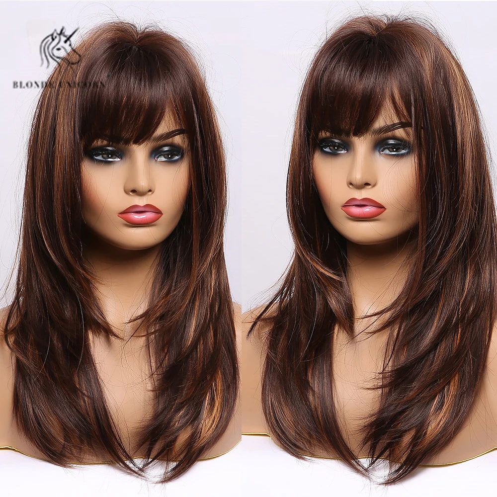 Brown Highlights Blonde Natural Layered Hair Wigs With Bangs Long Wavy For Women Ebay